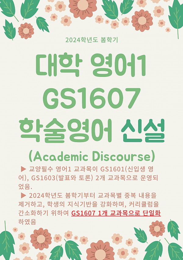 학사 교양영어필수 (대학영어1) GS1607 신설 안내 페이지 정보 작성자 학사기획실(언어교육) 작성일24-01-09 13:34 조회3,728회 댓글0건 이전글 다음글 목록 본문 신입생 대상 영어1 교과목 면제 방법과 절차는 OT에서 안내드리도록 하겠습니다. 댓글목록 등록된 댓글이 없습니다. 이전글 다음글 목록