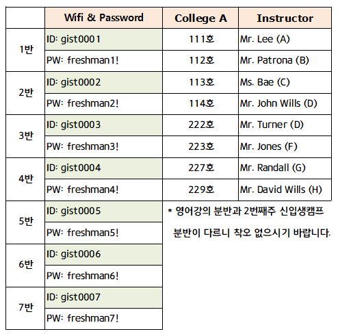 2023 신입생캠프 영어강의 (강의실, 분반) 안내(3) 페이지 정보 작성자 미래교육센터 작성일23-02-06 12:44 조회3,053회 댓글0건 이전글 다음글 목록 본문 2023.02.08 강사님별 강의실이 배정되었으니 참고하여 주시기 바랍니다. 댓글목록 등록된 댓글이 없습니다. 이전글 다음글 목록