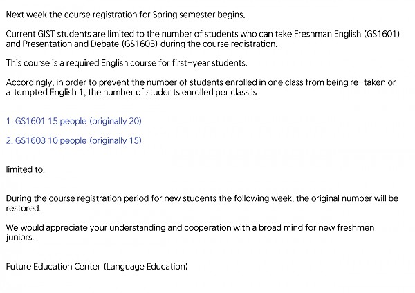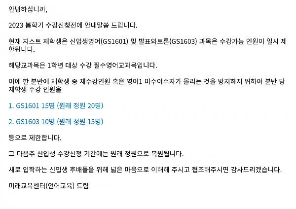 2023년도 봄학기 대학 영어1 과목 재학생 수강인원 일시 제한 안내 페이지 정보 작성자 미래교육센터 작성일23-02-09 11:47 조회2,829회 댓글0건 이전글 다음글 목록 본문 재학생 수강신청 기간 중 대학 영어1 과목 수강신청 관련 안내입니다 댓글목록 등록된 댓글이 없습니다. 이전글 다음글 목록