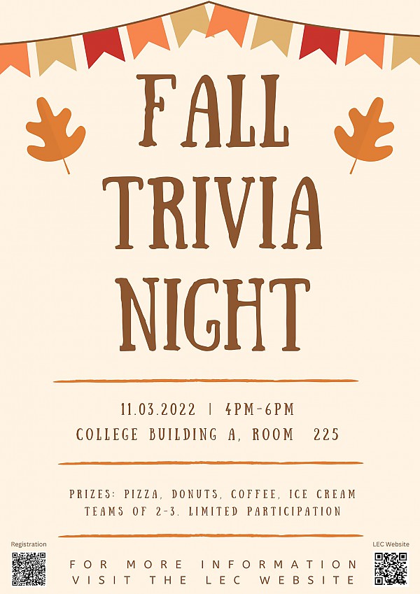 Are you ready to show off your knowledge while competing with your classmates and winning great prizes? Join us for our Fall LEC Trivia Night. You can solve puzzles, answer trivia and have a great time in a relaxing environment.