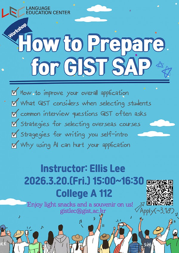 This workshop is meant to help prepare students for GIST's Study Abroad Program(SAP) and is ideal for new students who have about 1.5 or 2 years before applying to SAP